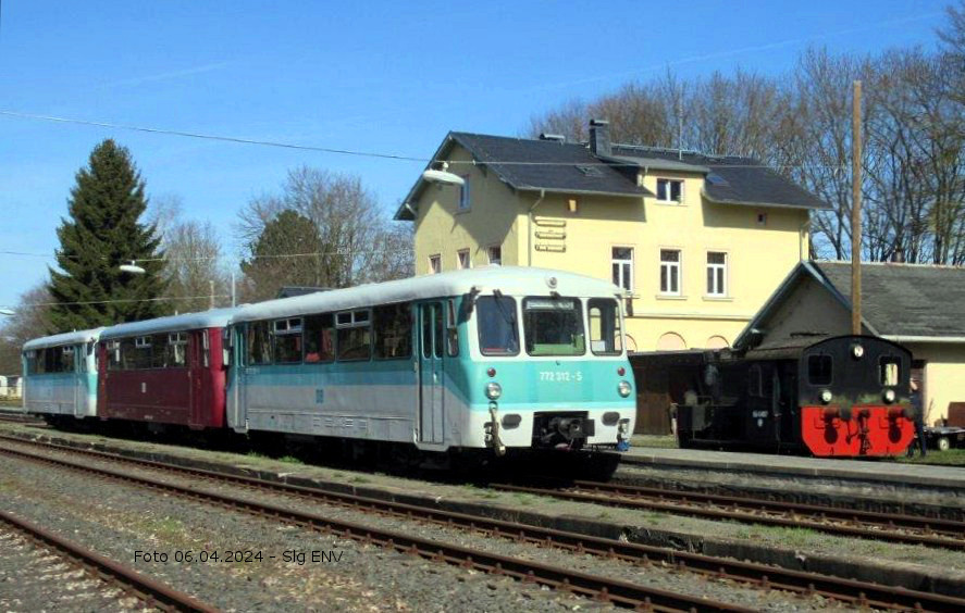 Bahnhof Aue am 05.04.2024 - ENV auf dem Weg zur Erzgebirgischen Aussichtsbahn für die Fahrten am Sonnabend
