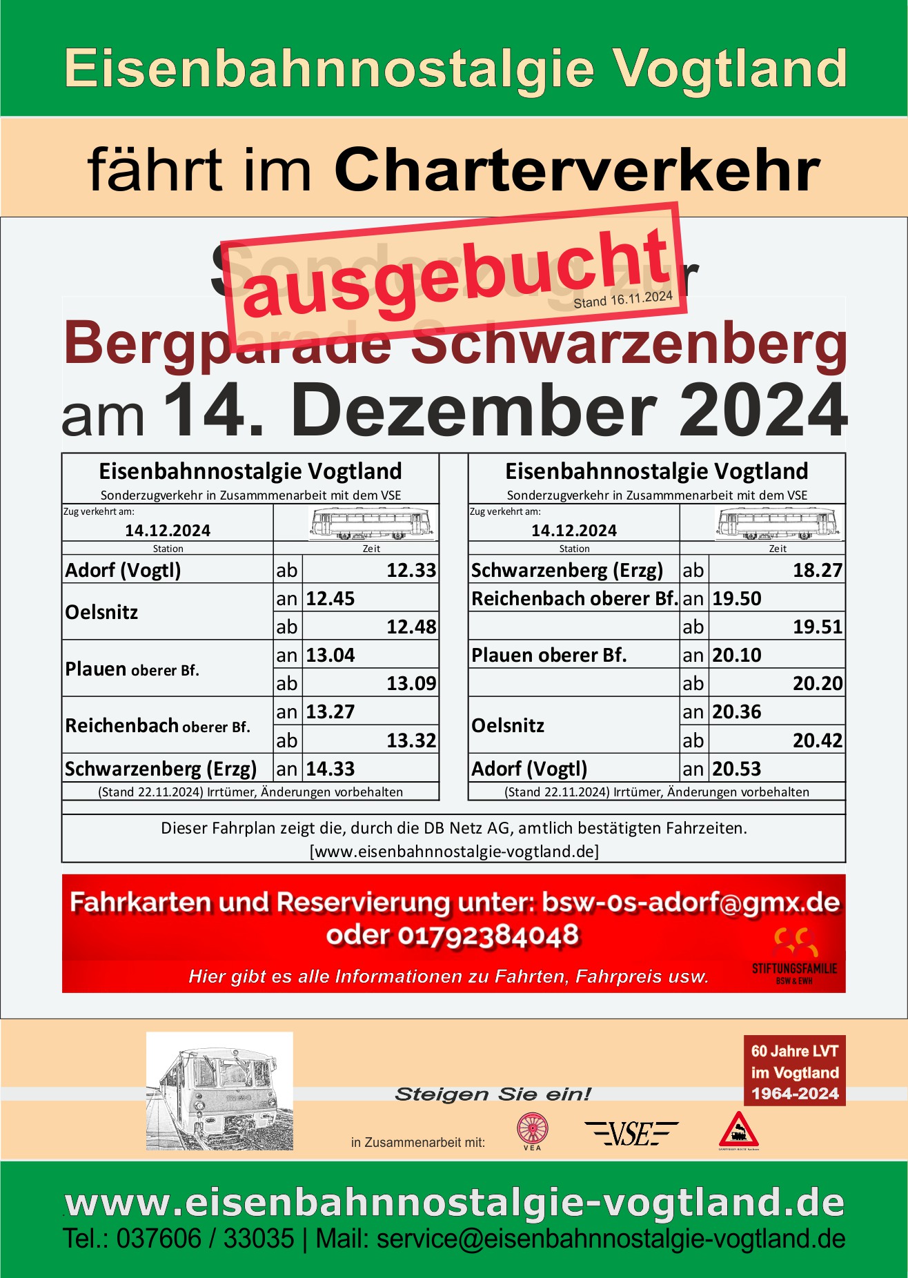 Auf gehts zur Bergparade nach Schwarzenberg mit den historischen Triebwagen der Eisenbahnnostalgie Vogtland. Start ist 12.34 Uhr am Bahnhof Adorf. Nach der Ankunft fahren uns die LVT weiter ins Eisenbahnmuseum zur Besichtigung mit Führung (Eintritt frei mit Fahrkarte). Im Anschluss bringt uns der Zug zurück zum Bahnhof und damit ganz nahe an die denkmalgeschützte Altstadt mit ihrem Weihnachtsmarkt. Hier startet um 17.00 Uhr dann auch die Bergparade. Nach deren Abschluss fahren wir zurück bis ins vogtländische Adorf.