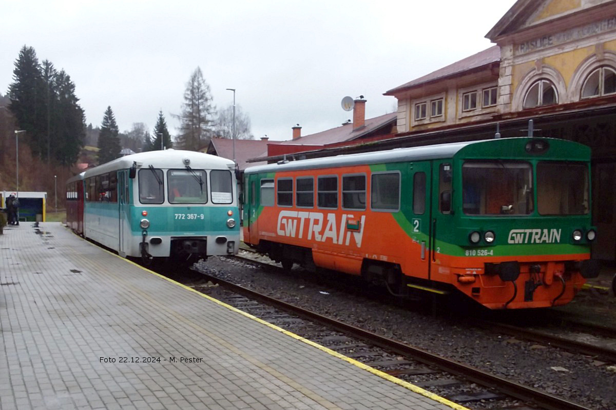 Die ENV war am 29.Mai 2025 wieder zu Sonderfahrten Adorf-Zwotental-Kraslice für den OVEB e.V. unterwegs. Anläßlich "25 Jahre Wiedereröffnung Klingenthal-Kraslice / 25 Jahre EgroNet" wurde an diesem Tag in Klingenthal planmäßig gehalten.